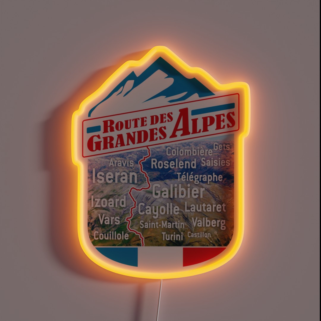 Experience the majesty of the French Alps with our vibrant Route des Grandes Alpes RGB neon sign, perfect for any mountain enthusiast’s home or office decor.