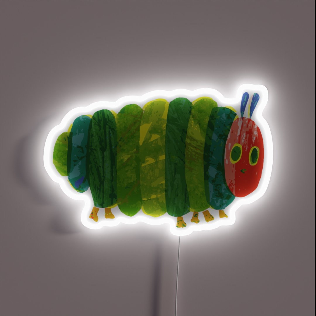 Vibrant RGB neon sign featuring Eric Carle’s beloved character, The Very Hungry Caterpillar, perfect for children’s bedrooms or nursery decor.