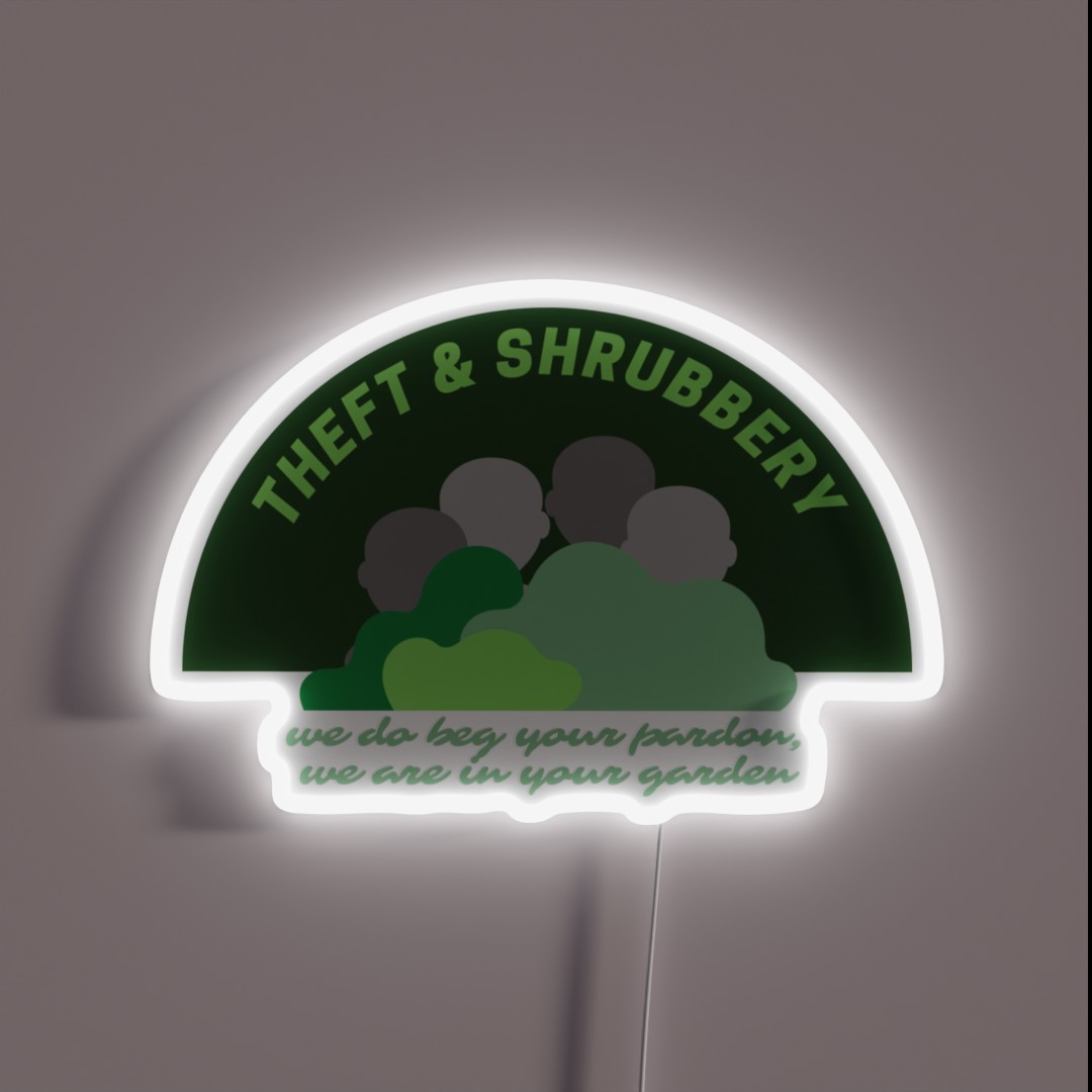 Add a touch of whimsy to your space with our unique Theft & Shrubbery RGB Neon Sign. A humorous take on the classic ‘Shrubs’ phrase from Monty Python’s Flying Circus, this eye-catching sign features colorful LED lighting that changes between red, green, and blue hues.