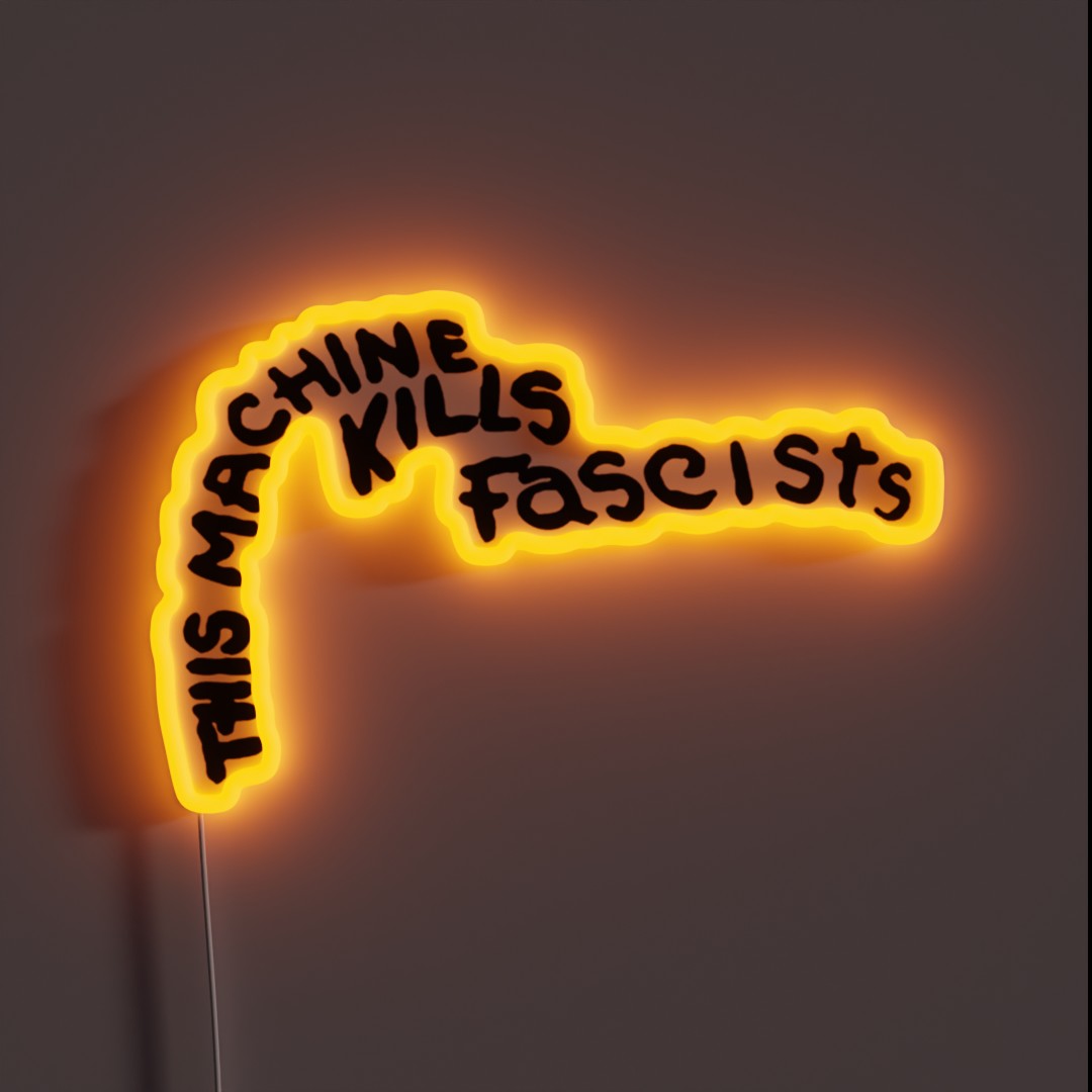 Perfect for music lovers, activists, and anyone who dares to be different, this sign is a statement piece that’s sure to spark conversations. Its sleek design and vibrant colors will illuminate any room, making it an unforgettable addition to your home or office decor. Get ready to make a bold statement with the “This Machine Kills Fascists” Guthrie Guitar RGB Neon Sign!