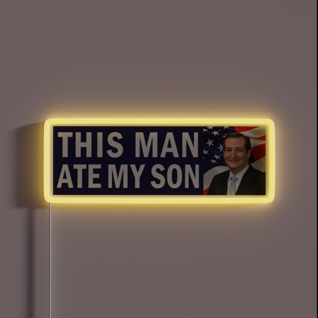 Add a touch of sarcastic humor to your gaming space with this neon sign reading ‘This Man Ate My Son’ – perfect for gamers who love a good laugh and some RGB glow.