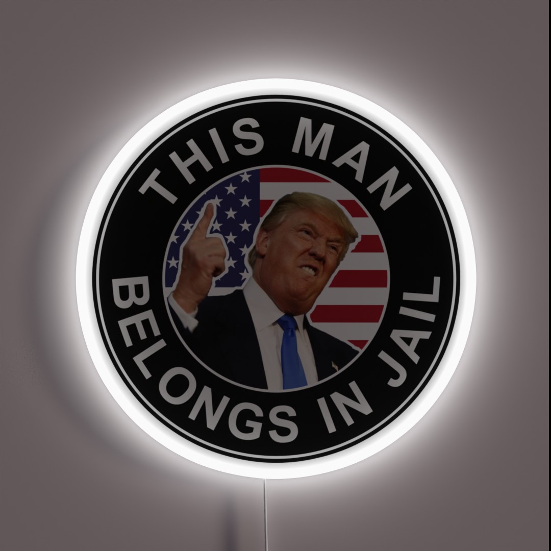 Display your sentiments with ‘This Man Belongs in Jail’ RGB neon sign, a unique and eye-catching statement piece.