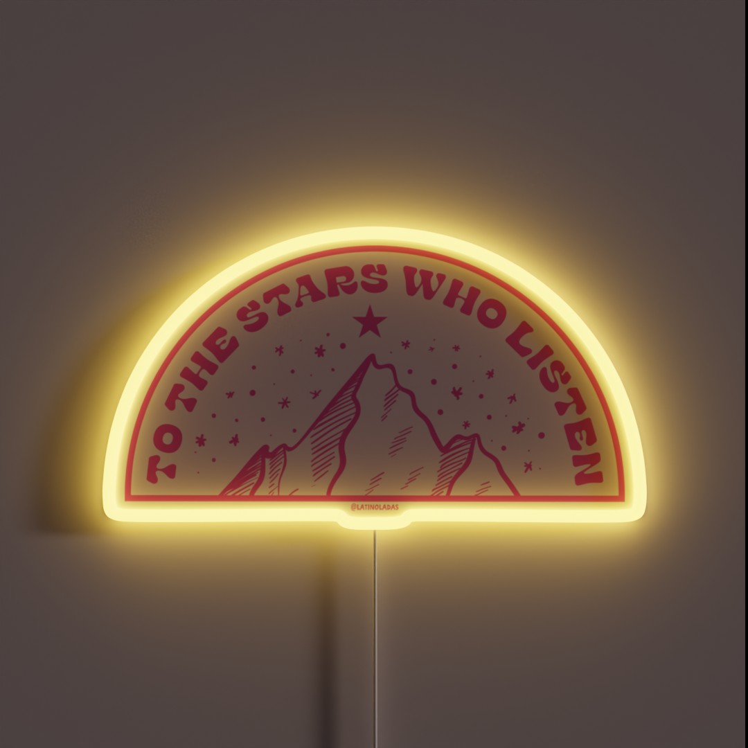Illuminate your bookish space with this vibrant, To The Stars Who Listen themed hot pink neon sign, inspired by the enchanting world of Sarah J. Maas’ Feyre and Rhysand from A Court of Thorns and Roses (ACOTAR). Perfect for book lovers and fans of BookTok, this unique gift is a must-have addition to any reading nook or library.