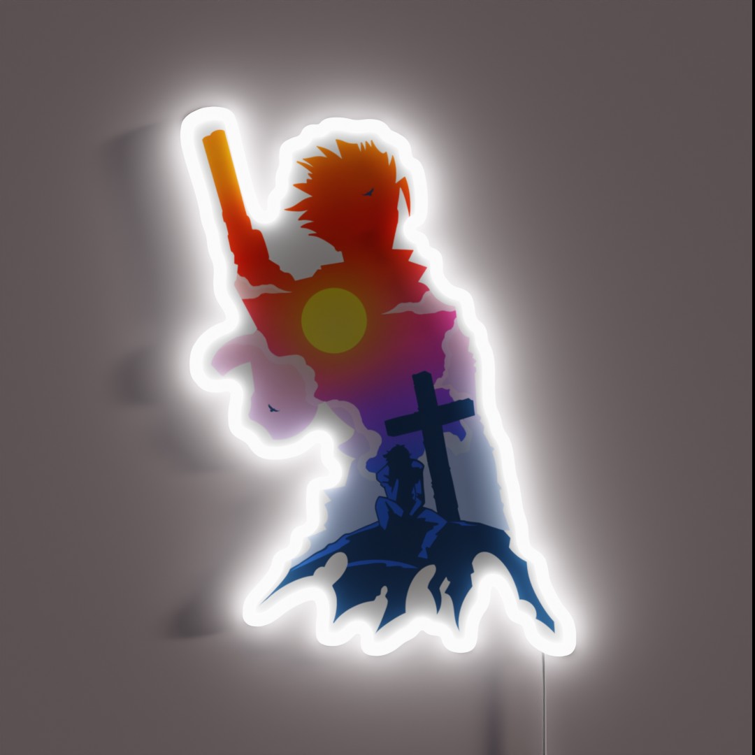 Elevate your space with the Trigun Vash X Wood Silhouette Art RGB Neon Sign, a vibrant and unique decorative piece featuring a stunning 3D silhouette of the beloved character Vash from the classic anime series.