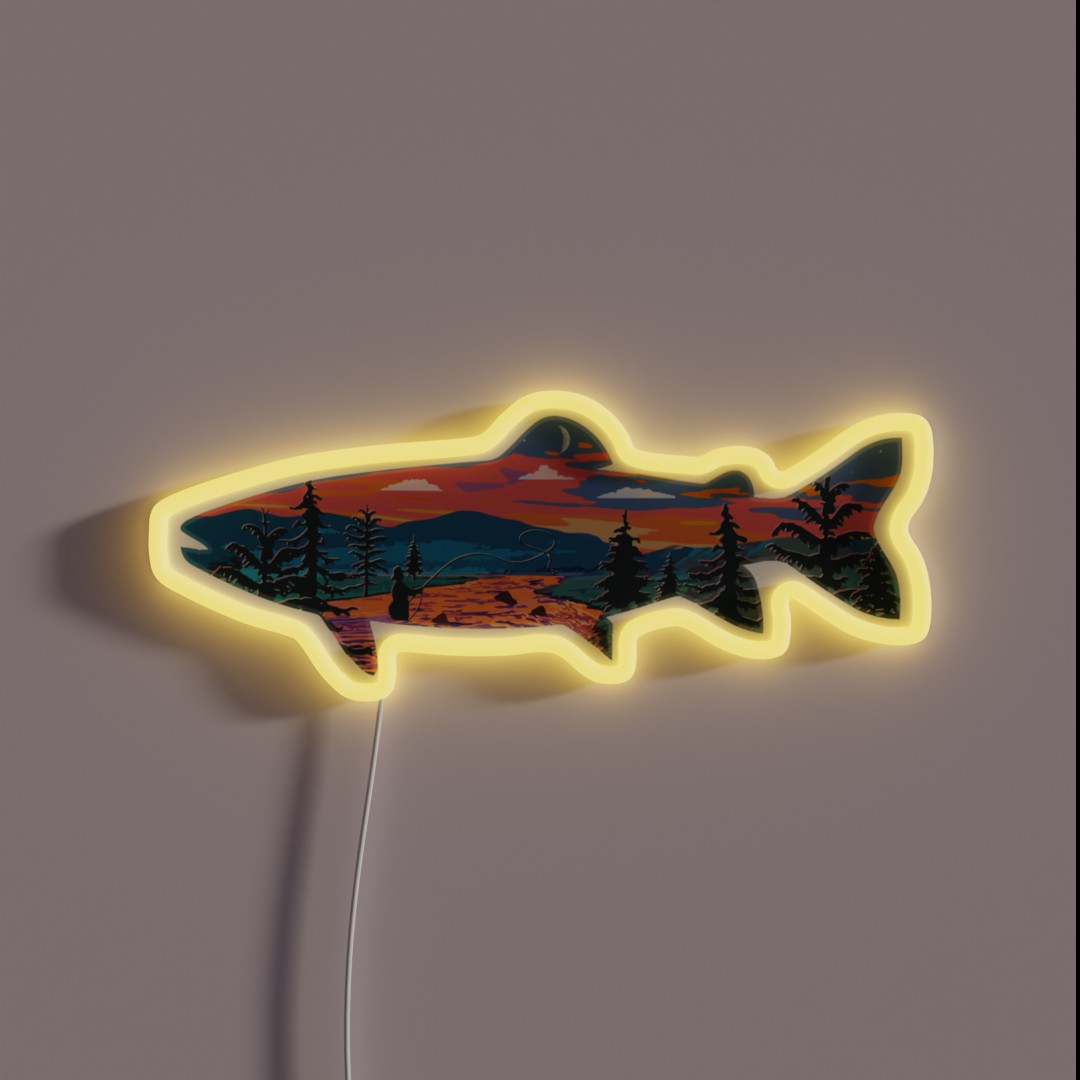 Bring the tranquility of a mountain sunset to your home with this vibrant Trout Silhouette Neon Sign, featuring the beauty of fly fishing amidst a serene river stream landscape.