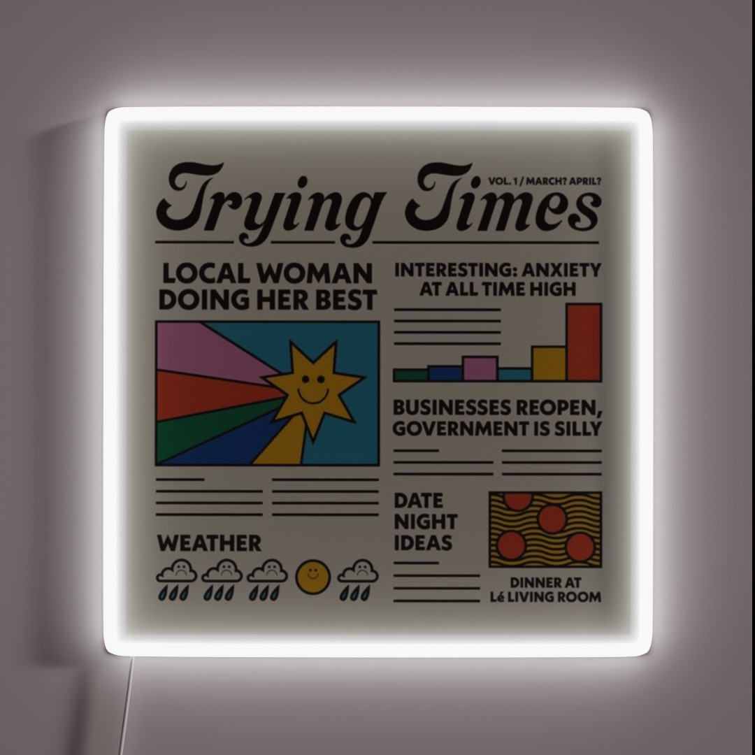 Introducing Trying Times, a vibrant and emotive aesthetic sign that brings a splash of colour to any space. This neon-inspired design is perfect for those who want to add a touch of personality to their home or office.