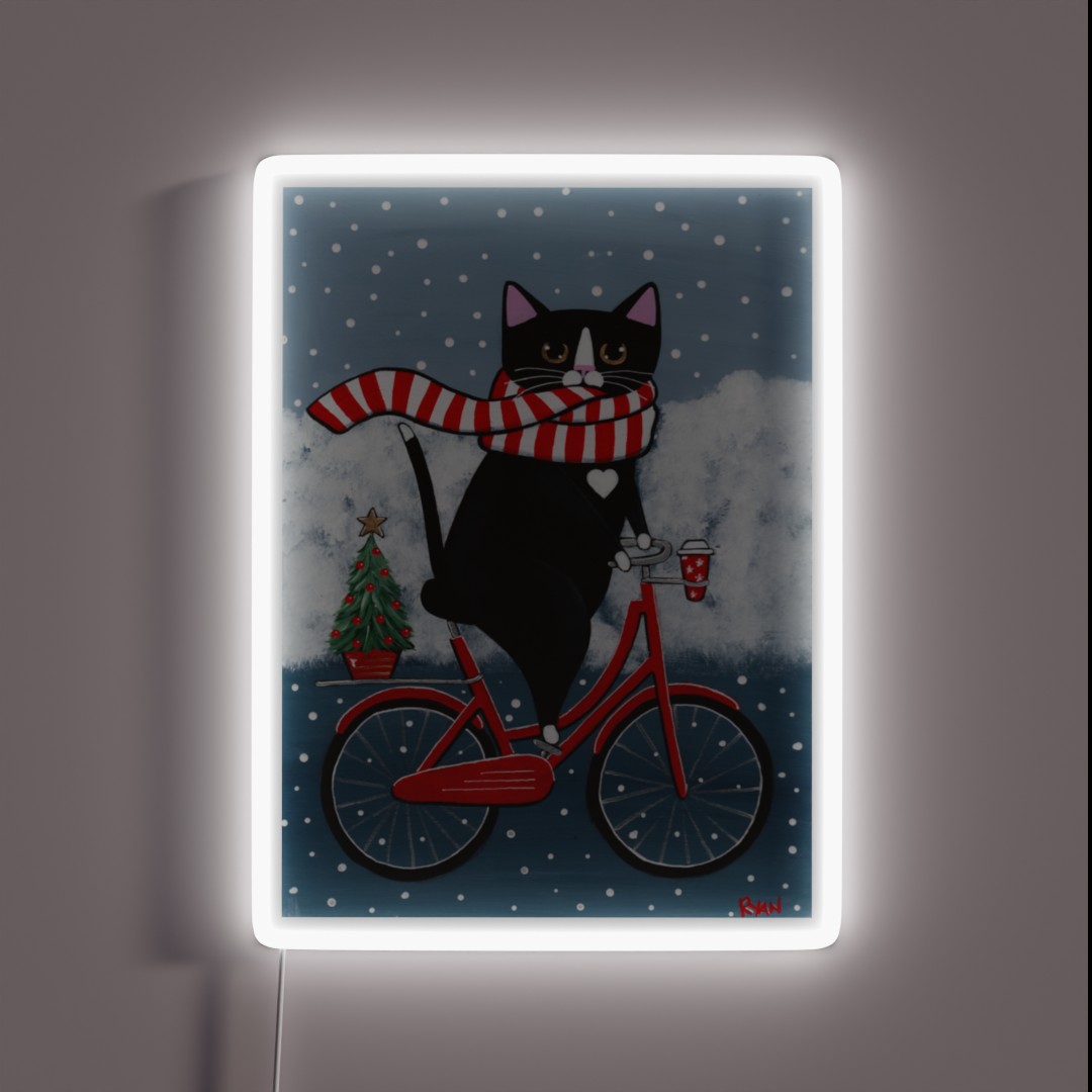 **Add a touch of whimsy to your home with the Tuxedo Cat Winter Bicycle Ride RGB Neon Sign**