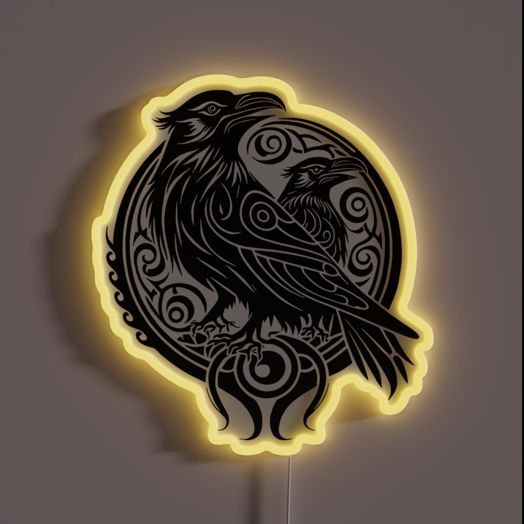 Elegant RGB neon art featuring two ravens in silhouette, inspired by tribal mythology, adding mystique and drama to any room.