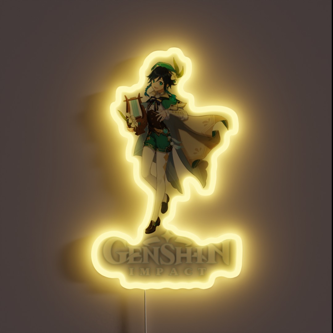 Bring vibrant ambiance to any gaming setup with our custom Venti Genshin Impact Perfect Gift RGB neon sign, featuring sleek design and radiant colors perfect for fans of the popular anime.