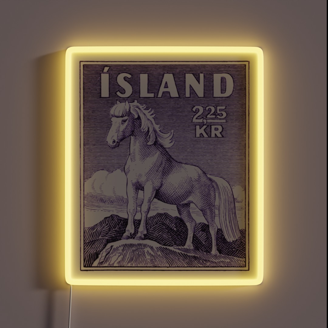 Unique blend of vintage nostalgia and modern flair, this 1958 Icelandic Horse Postage Stamp-inspired RGB neon sign adds a touch of retro charm to any room.