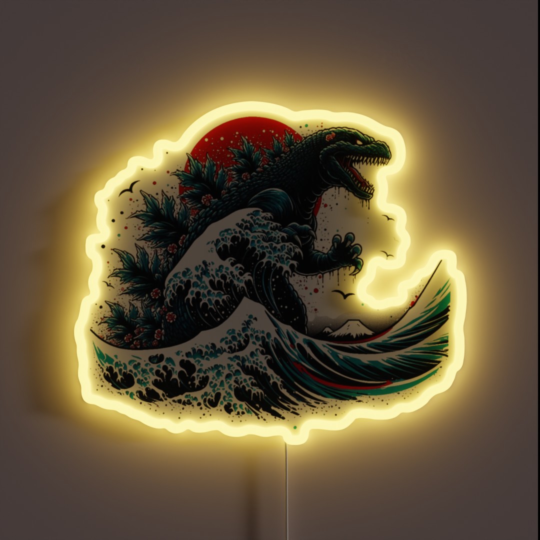 Vintage Japanese Godzilla Great Wave RGB Neon Sign