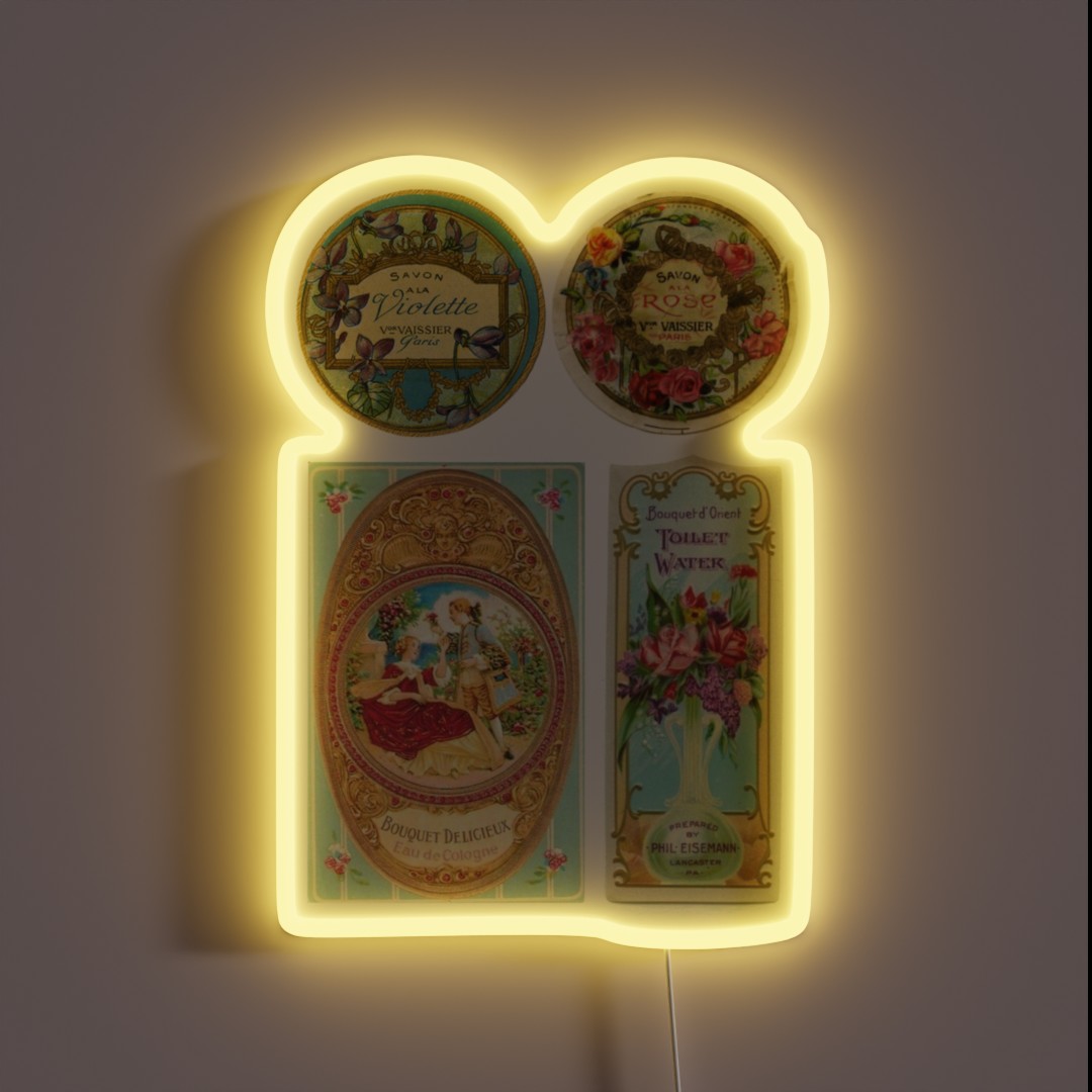 Add a touch of nostalgia and whimsy to your scrapbooks or home decor with these unique vintage-themed labels featuring RGB neon signs and toiletry designs.