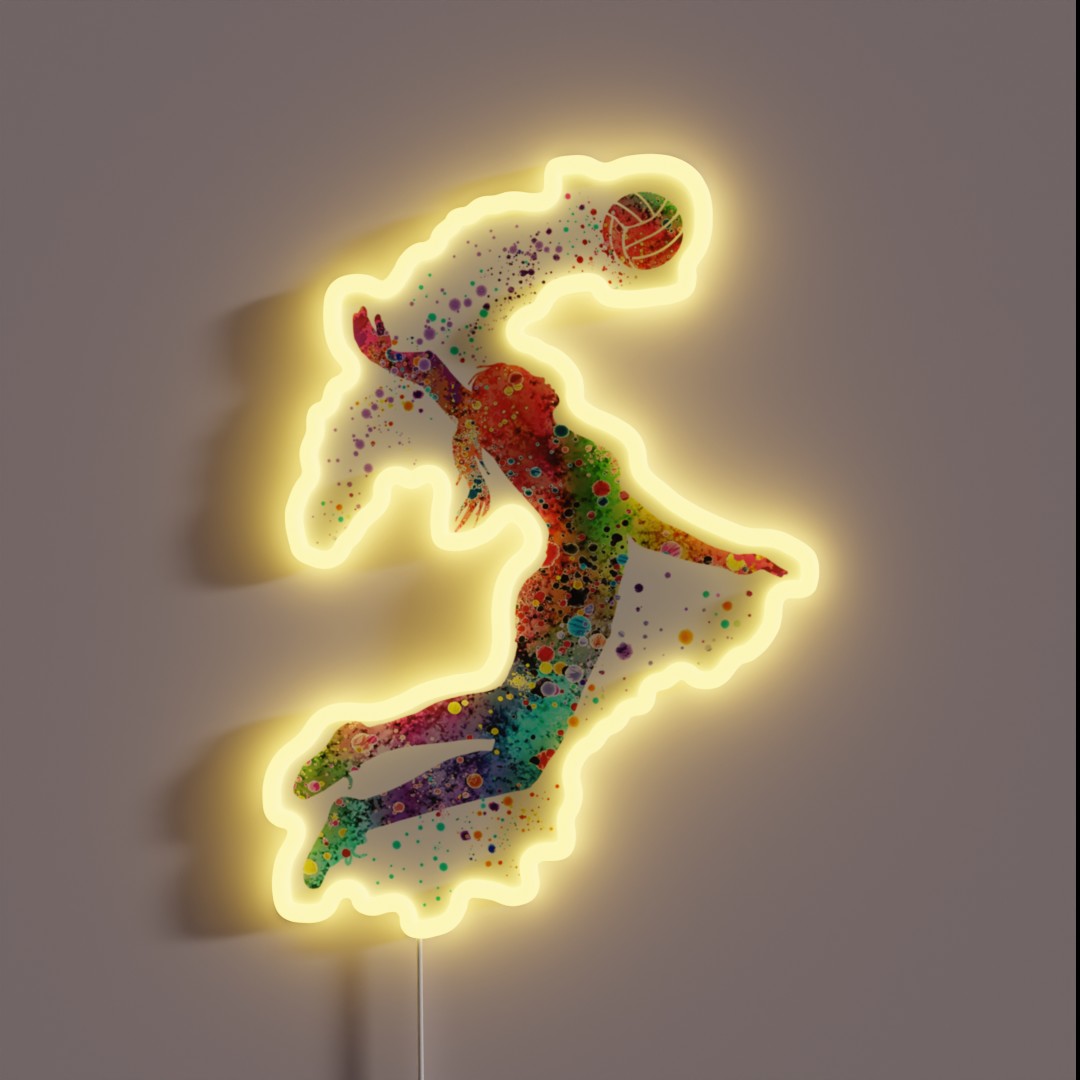 Add vibrant style to your sports enthusiast’s room with this stunning volleyball girl watercolor painting art print, available as a neon-lit wall decoration perfect for sports gifts.