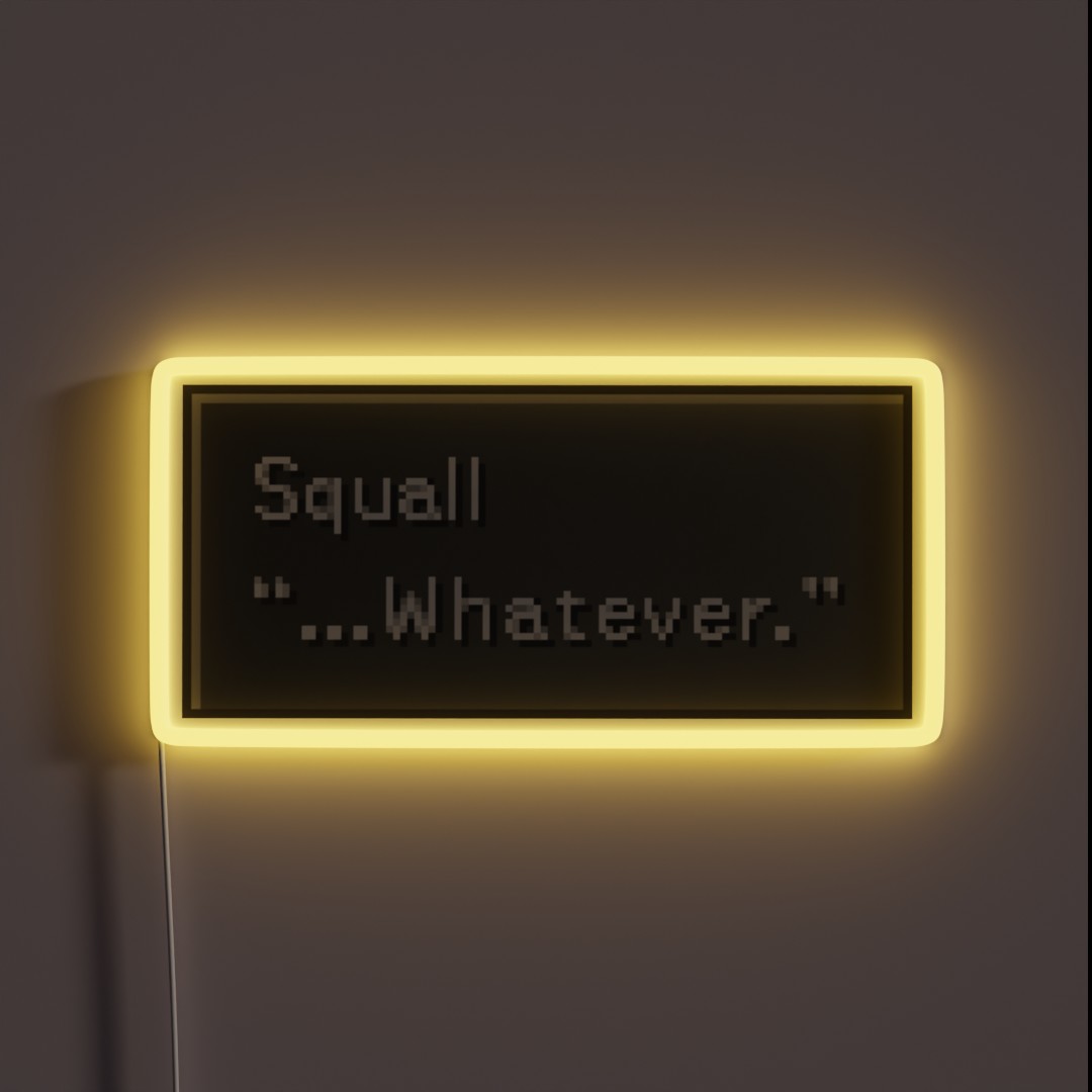 Add a touch of Final Fantasy magic to your gaming space with this vibrant Whatever Squall Leonhart Dialogue Box RGB neon sign, featuring iconic character dialogue from the beloved game.