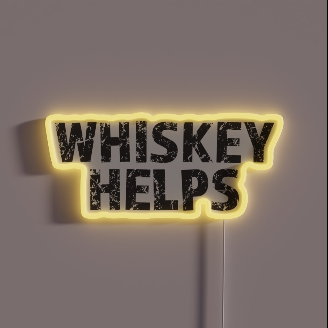 A unique, handcrafted Whiskey Helps RGB neon sign that adds a touch of sophistication and humor to any home bar or office space, featuring colorful LED lights that can be customized with various color schemes.