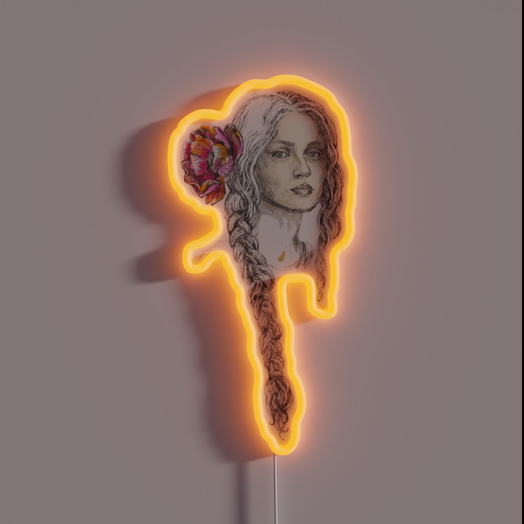 A vibrant and unique RGB neon sign featuring an illustration of a woman with braided hair, perfect for adding a touch of bohemian chic to any room.