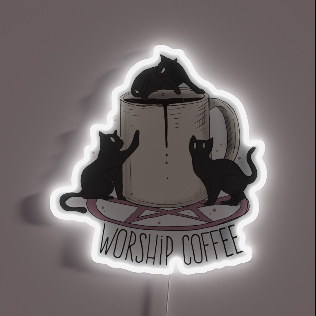 Add a pop of whimsy to your home decor with this vibrant Worship coffee kittens RGB neon sign, perfect for coffee lovers and cat enthusiasts alike.
