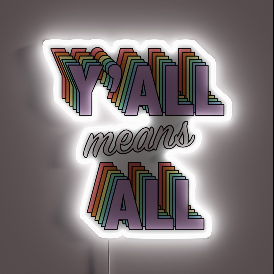 Brighten up your space with this vibrant and customizable Y’all Means All sign! Made with modern LED technology, this sign is not only visually stunning but also durable and long-lasting.