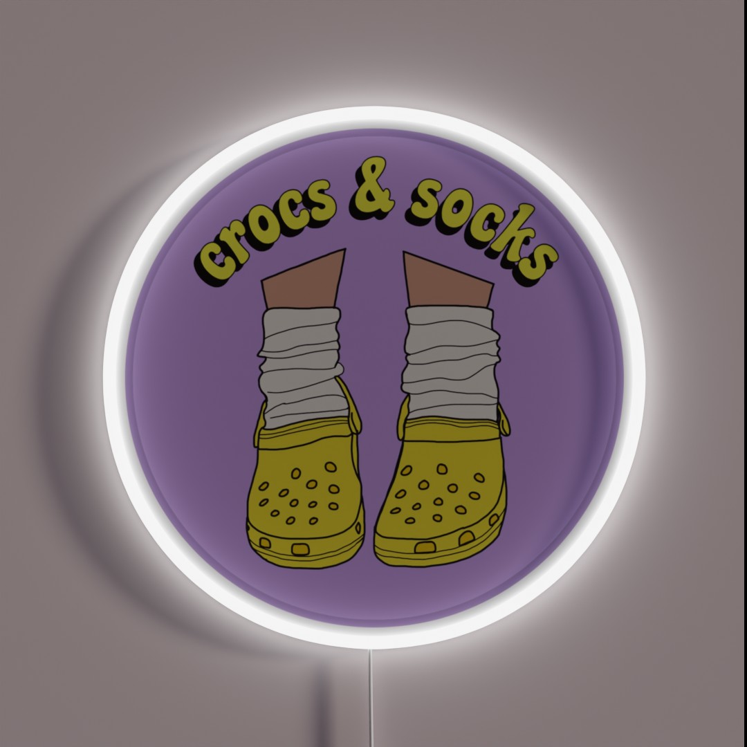 Brighten up your space with this vibrant Yellow Crocs and Socks LED sign that shimmers in dynamic RGB colors, perfect for a fun and playful decor accent.