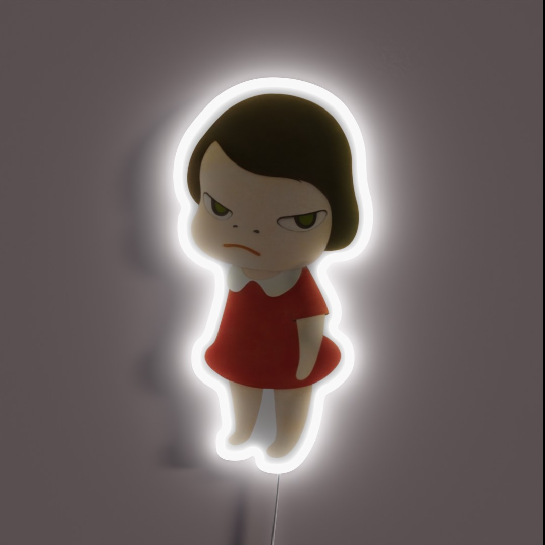 Inspired by the vibrant artwork of Japanese contemporary artist Yoshitomo Nara, this eye-catching neon sign is a stunning addition to any room. Featuring a iconic illustration of a young girl wearing a bright red dress, this LED sign showcases the artist’s signature style and whimsy.