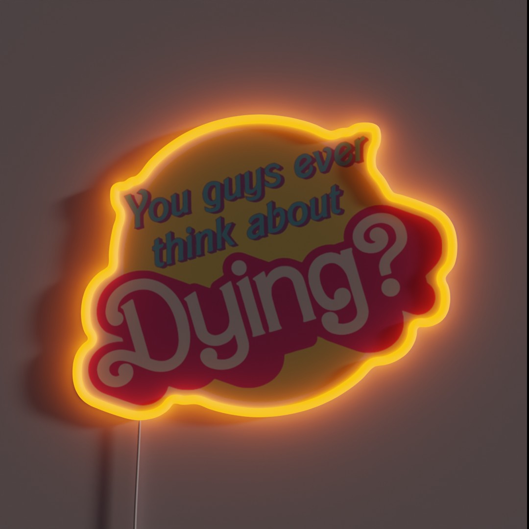 Bring some dark humor into your life and get ready to spark conversations with this unique and thought-provoking “You Guys Ever Think About Dying” RGB neon sign.