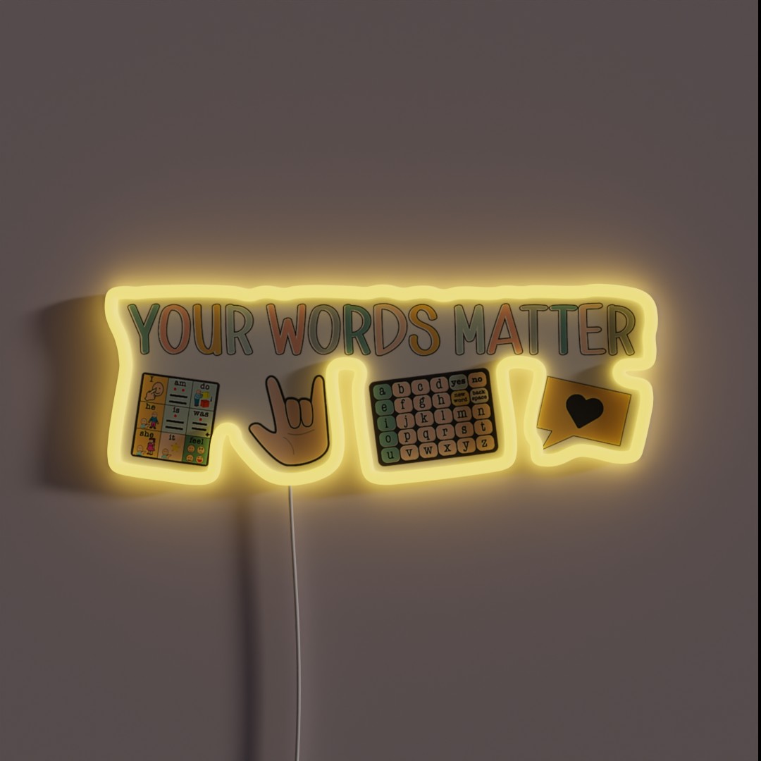 Empowering Communication – Customizable ‘Your Words Matter’ RGB Neon Sign for SLP, OT, AAC, ASL, and ABA/RBT Professionals to promote inclusive language support in therapy settings.