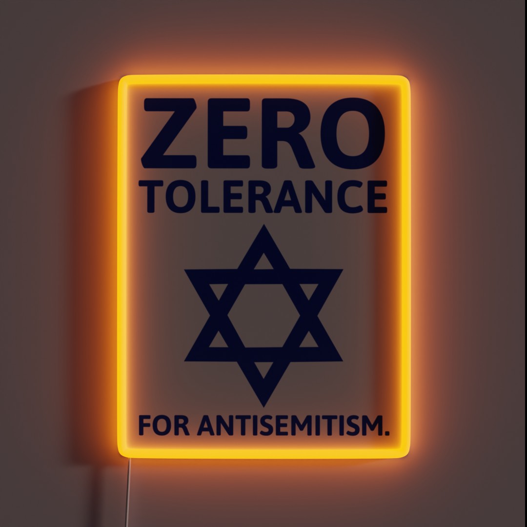 Stand against hate with our ‘Zero Tolerance for Antisemitism’ RGB neon sign, a powerful statement of solidarity and acceptance in a vibrant, eye-catching display.