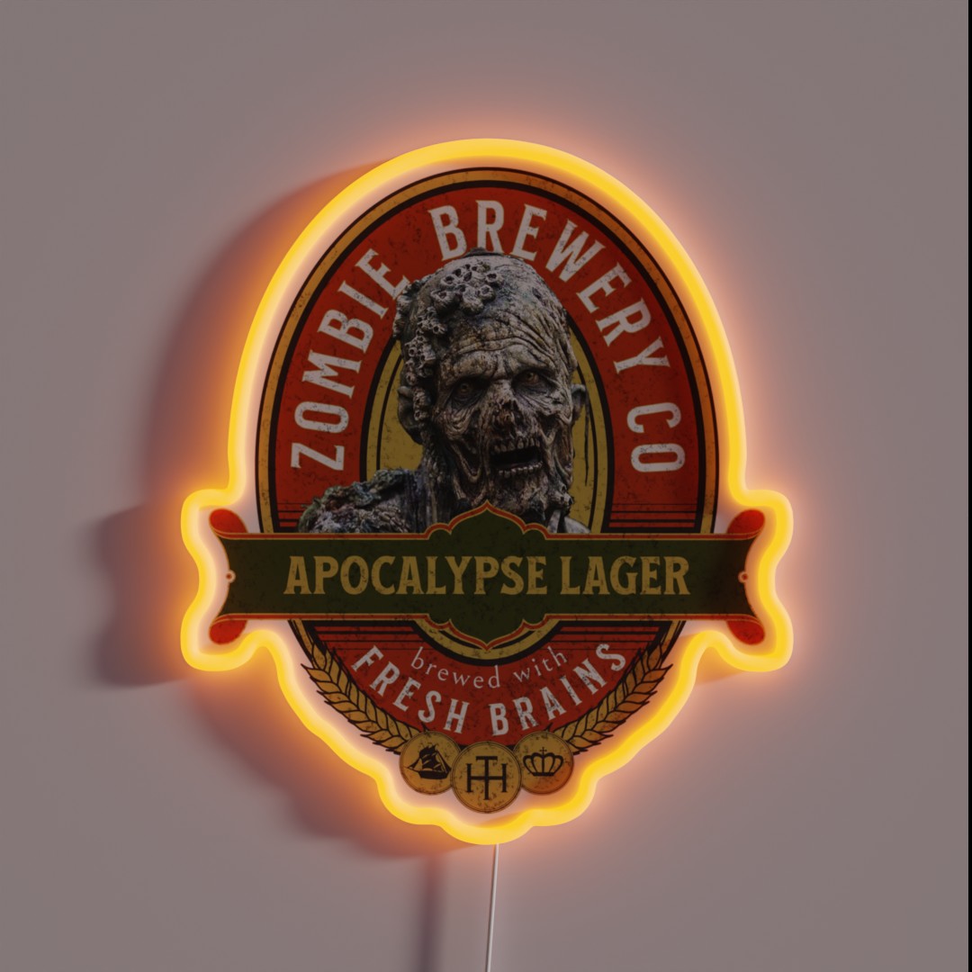 Add a chilling twist to your home bar with this vibrant RGB neon sign featuring the Zombie Apocalypse Beer Label design from Zombie Brewery Co, perfect for Halloween enthusiasts and beer lovers alike.
